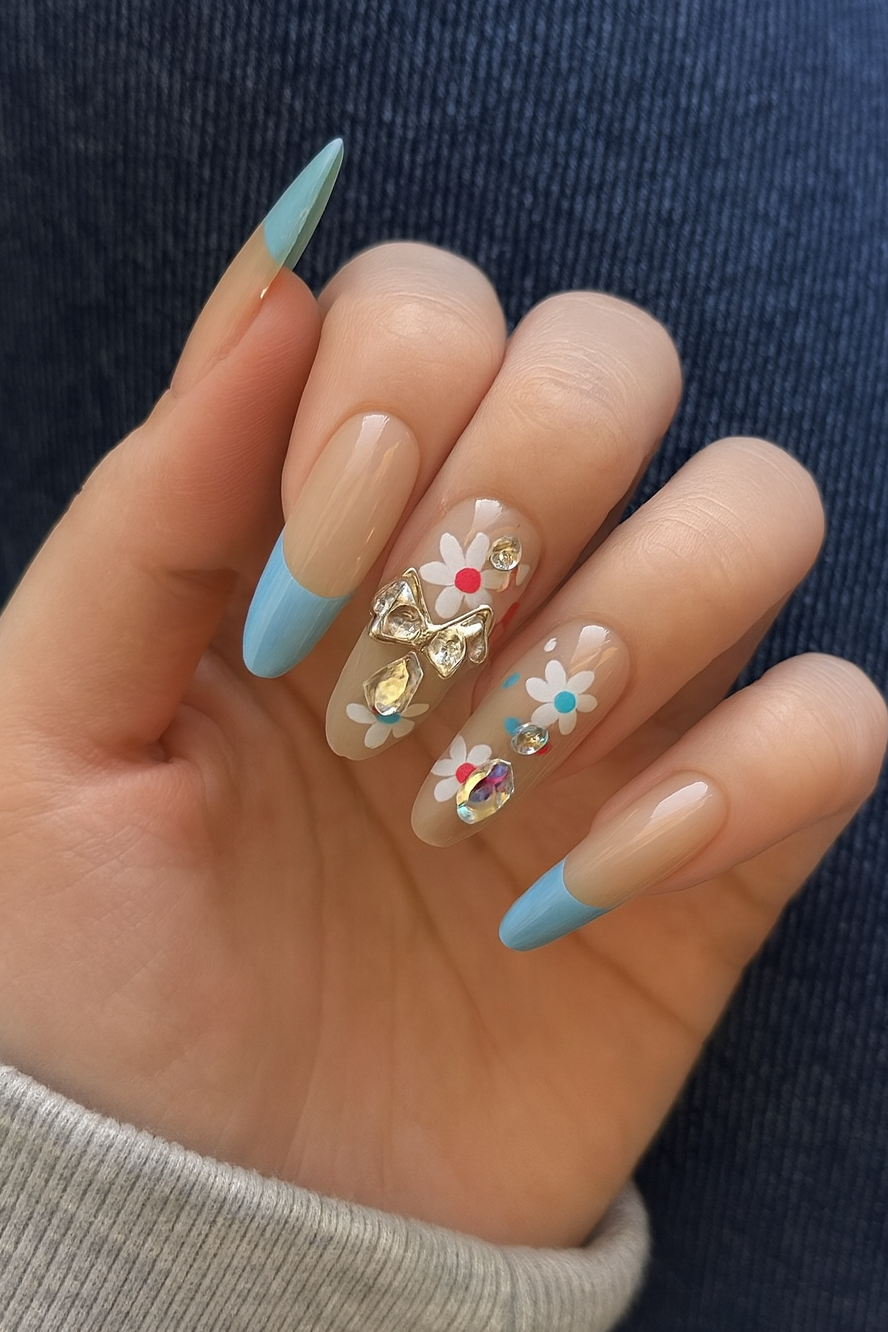 10'lu Krem Ve Mavi Renk Çiçek Figürlü Taş Detaylı Takma Tırnak Set (Yapıştırıcılı)