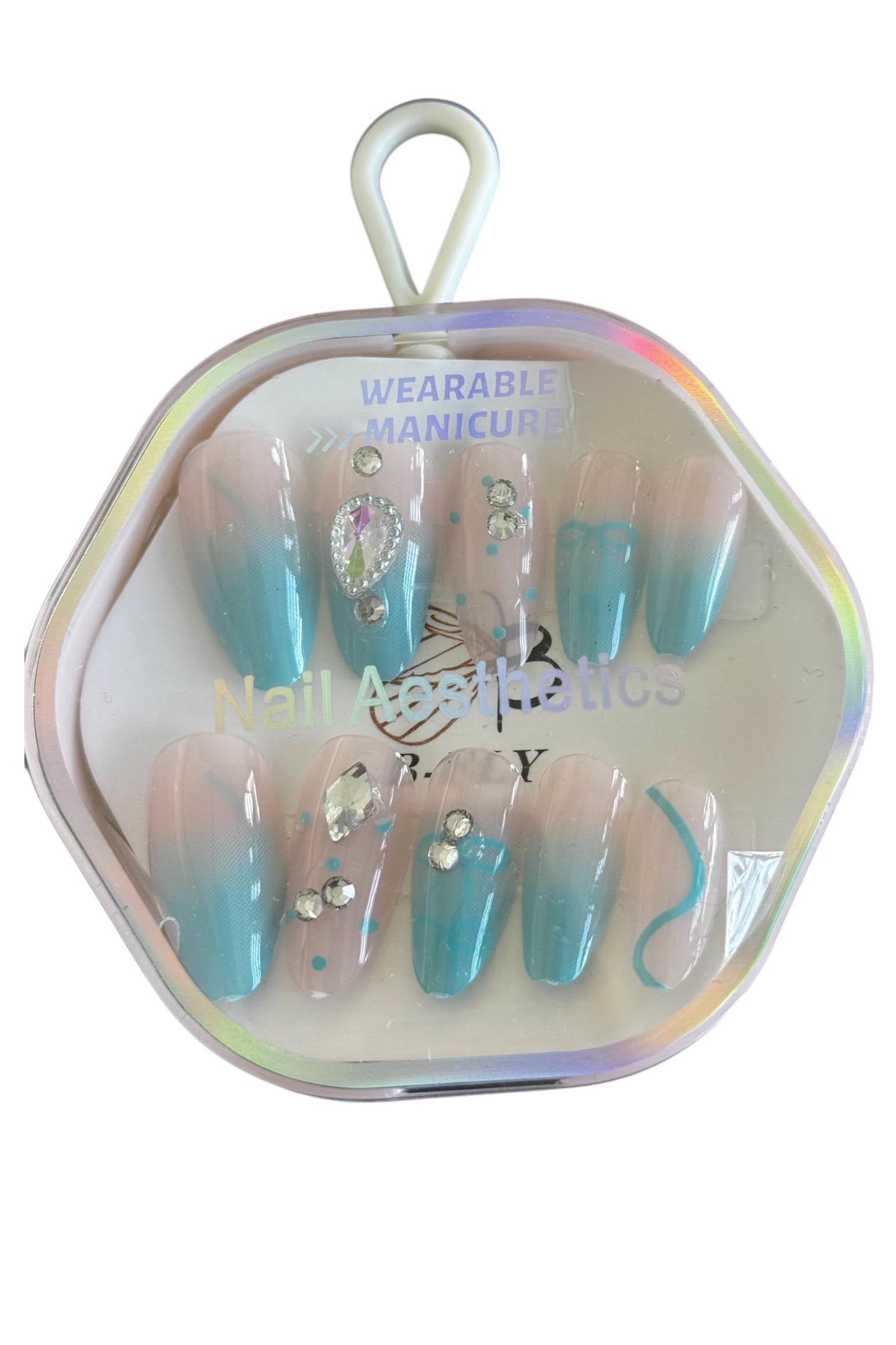 10'lu Pembe Ve Mavi Renk Taş Detaylı Takma Tırnak Set (Yapıştırıcılı)