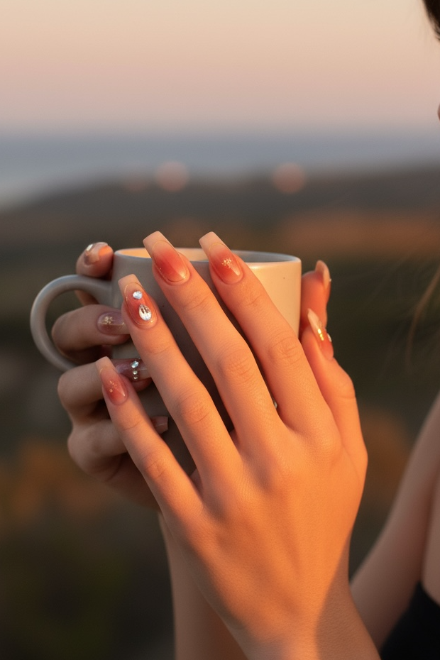 Zarif ve kendinden cilalı takma tırnaklar, etkileyici bir görünüm sağlar.