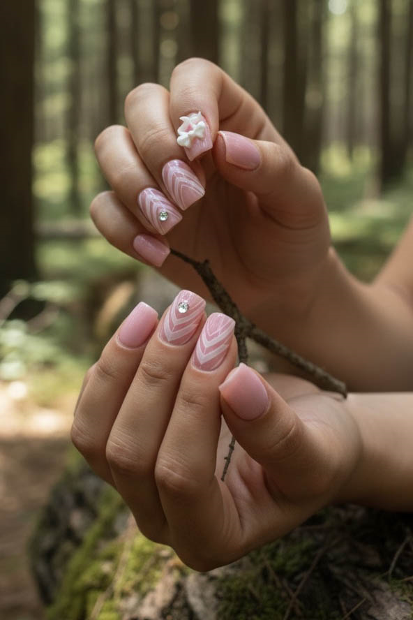 12'li Pembe Renk Kurdele Detaylı Takma Tırnak Set (Yapıştırıcılı)