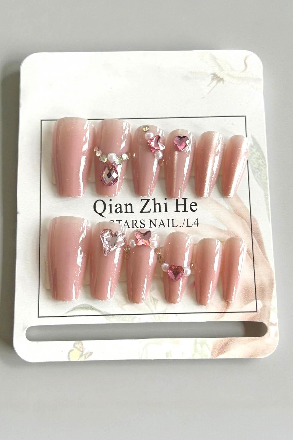 12'li Pembe Renk Taş Detaylı Takma Tırnak Set (Yapıştırıcılı)