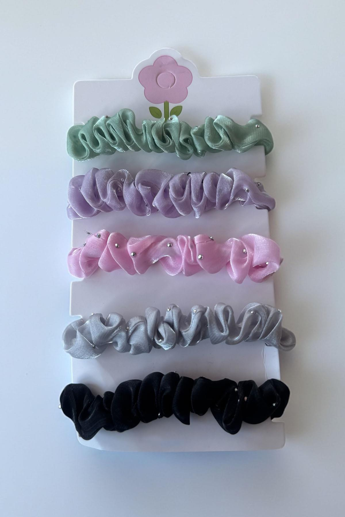 5'li Karışık Renk Taş Detaylı Lastik Toka Set