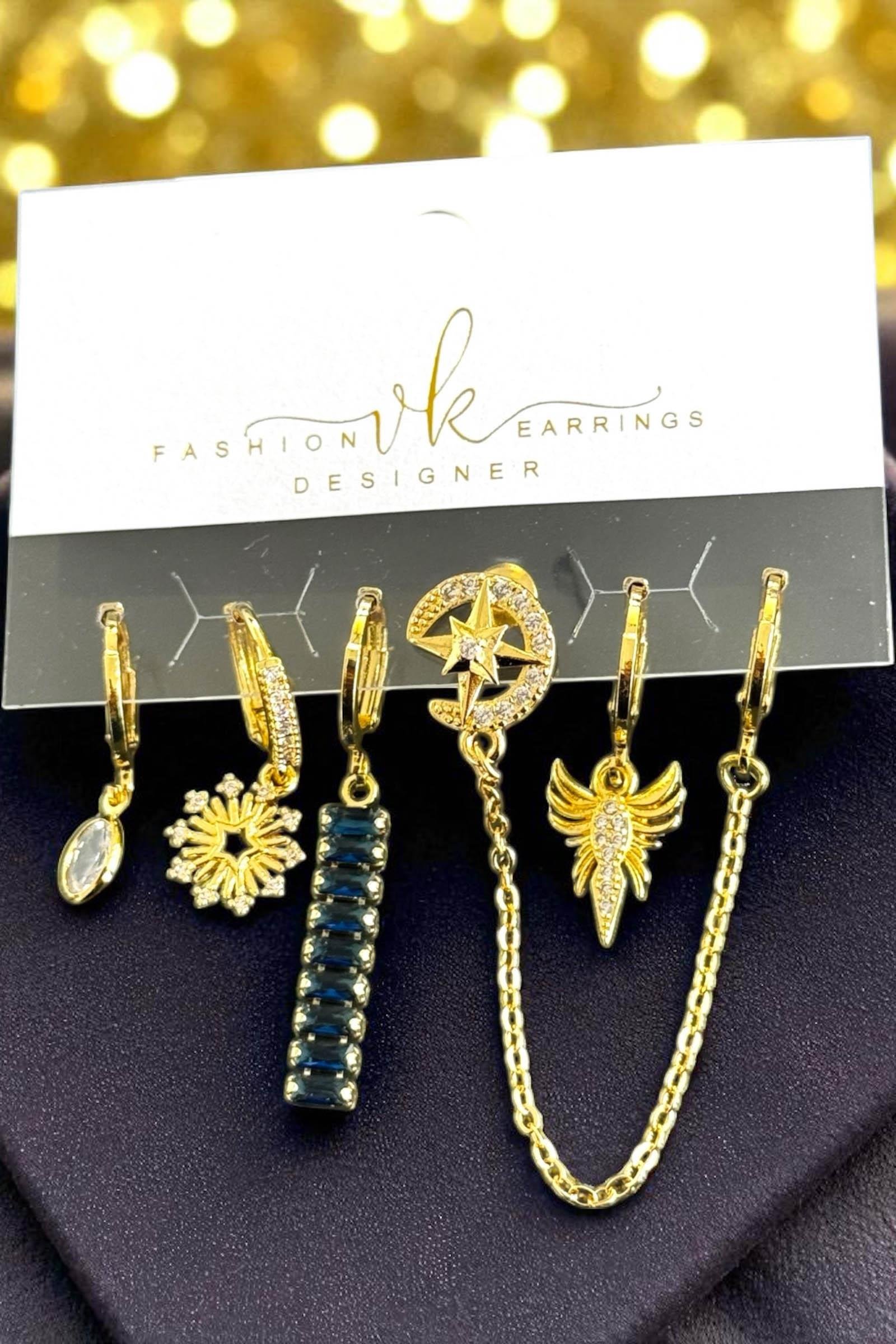6'lı Altın Renk Taş Detaylı Küpe Set