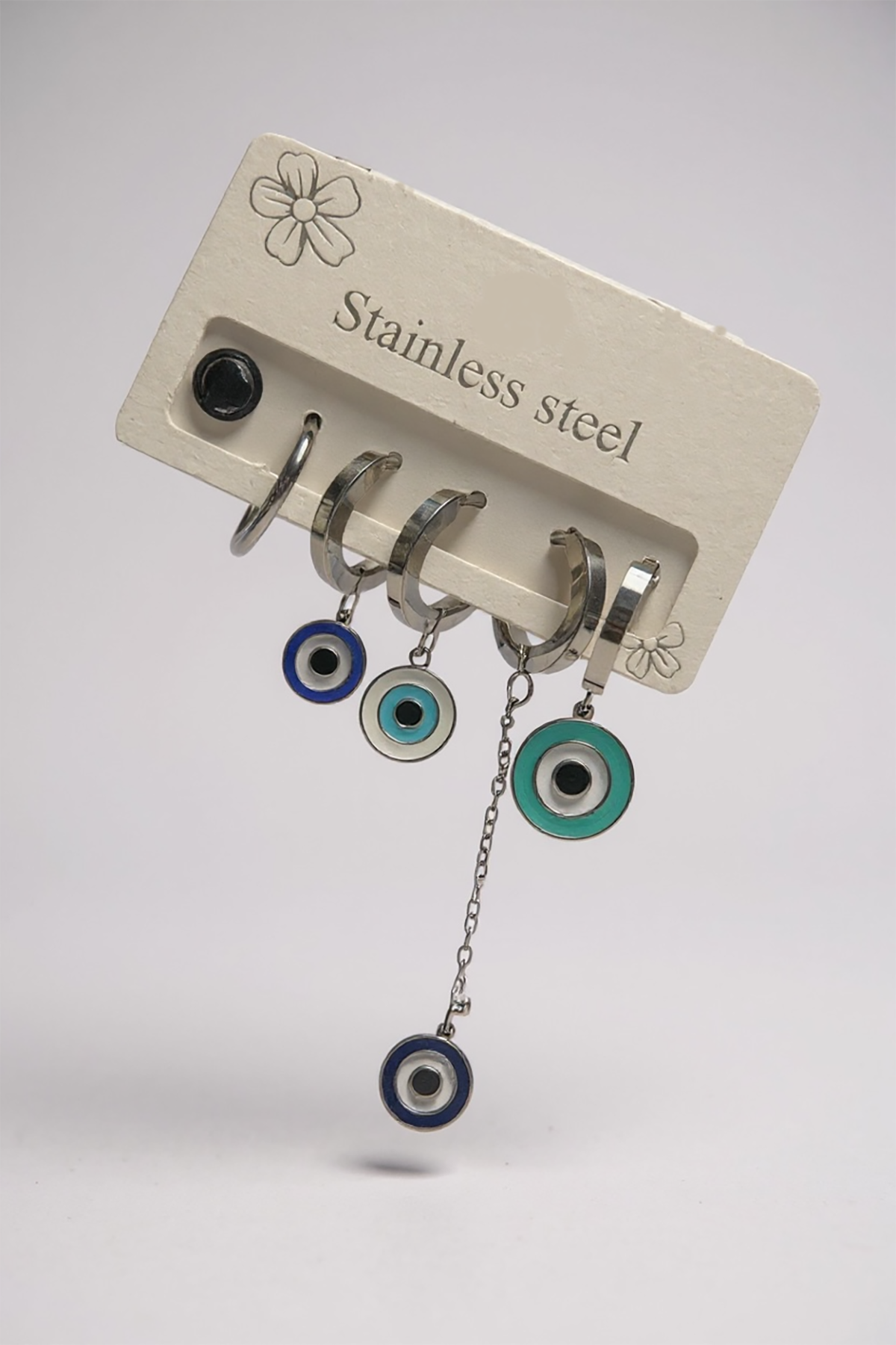 6'lı Gümüş Renk Nazar Boncuk Figürlü Çelik Halka Küpe Set