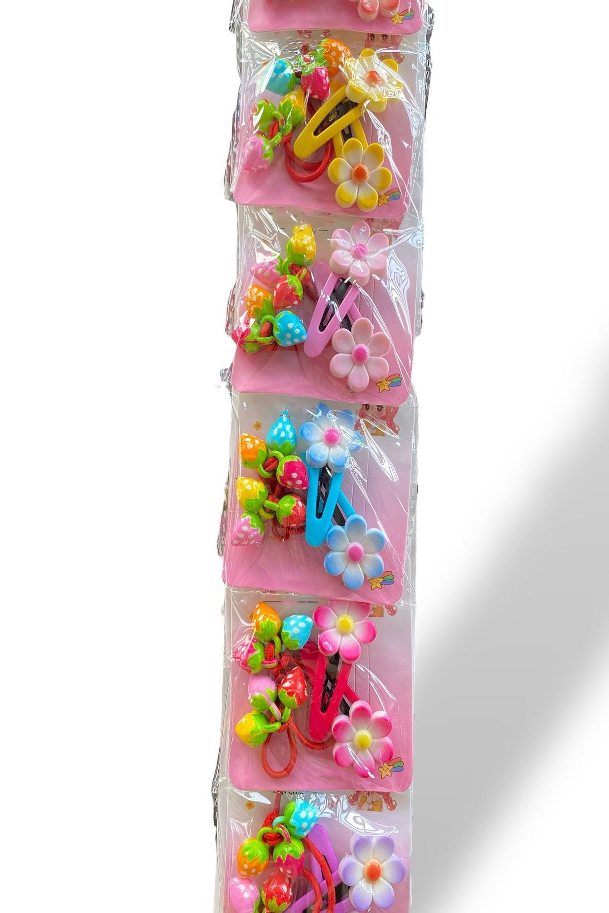 6'lı Karışık Renk Çiçek Ve Çilek Figürlü Lastik Ve Yan Toka Set