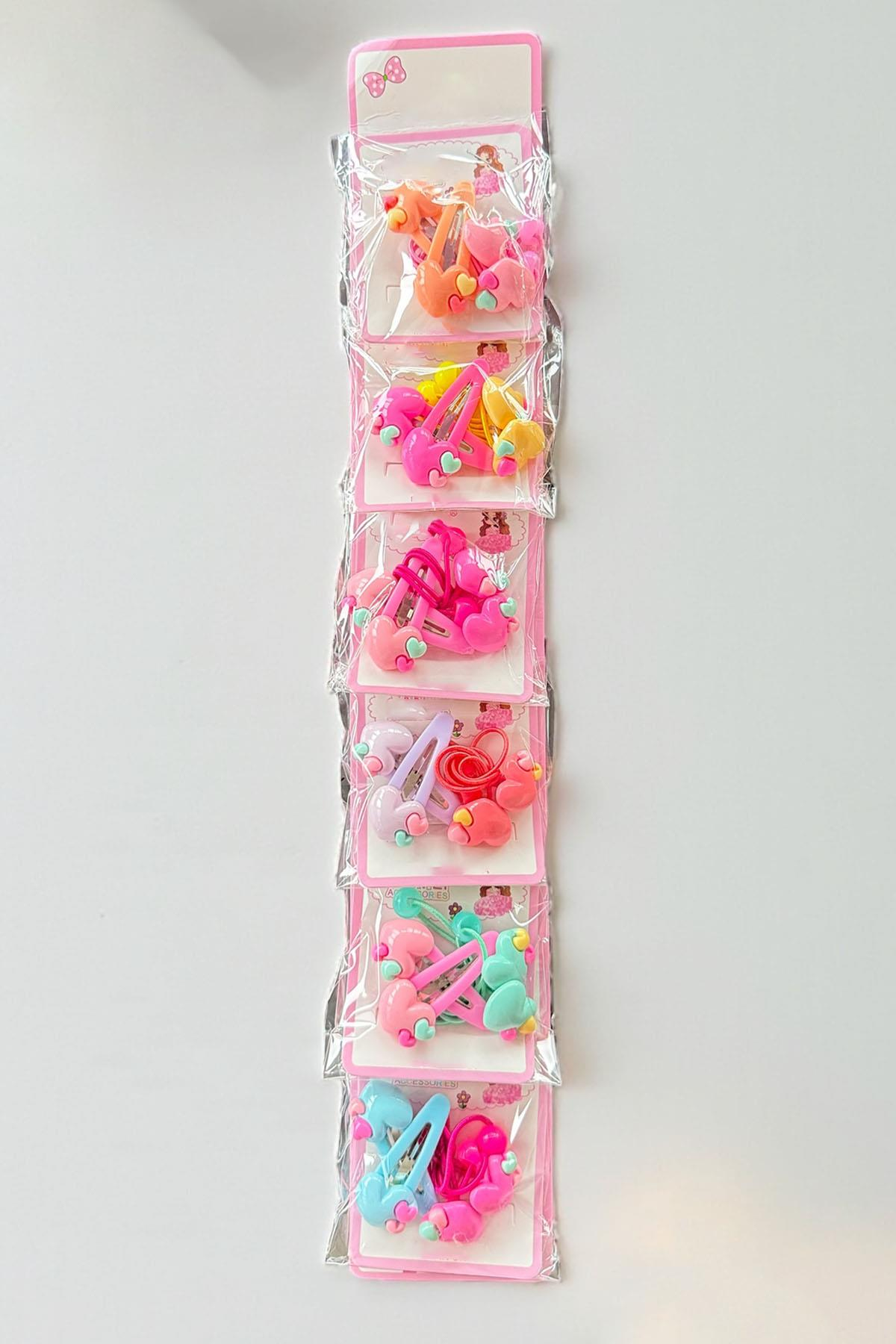 6'lı Karışık Renk Kalp Figürlü Lastik Toka Ve Yan Toka Set