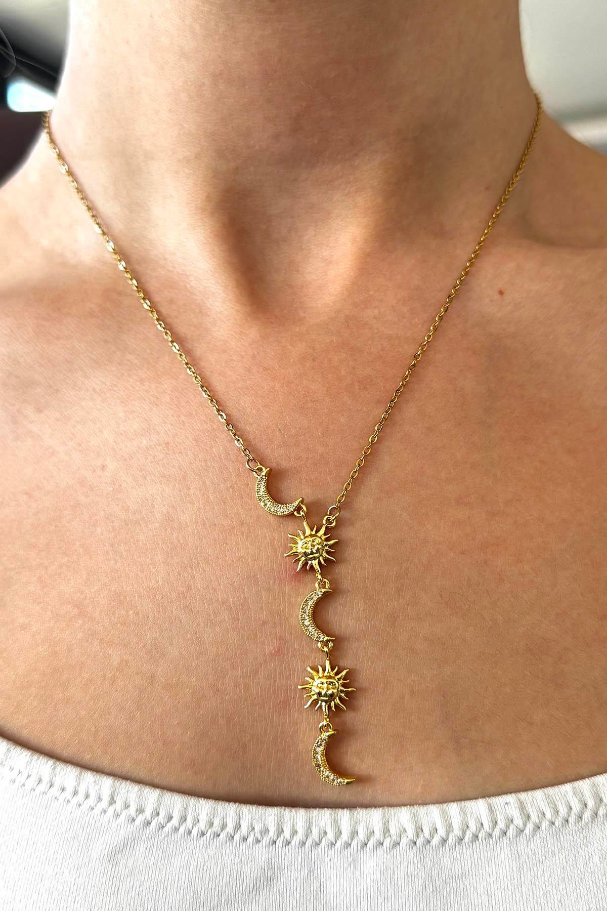 Altın Renk Ay Ve Güneş Figürlü Çelik Kolye