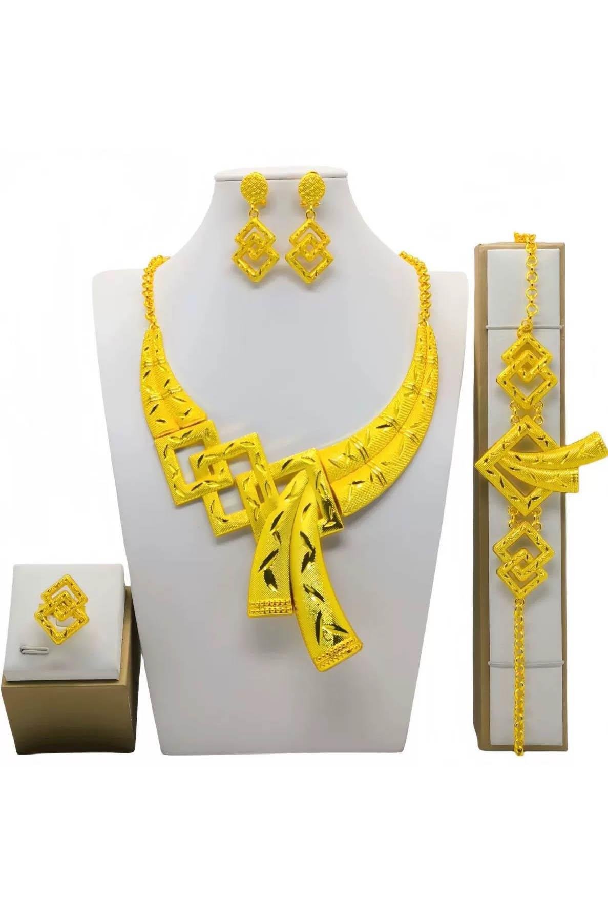 Altın Renk Çelik Kolye, Küpe, Bileklik, Yüzük Düğün Kına Nişan Gelin Seti