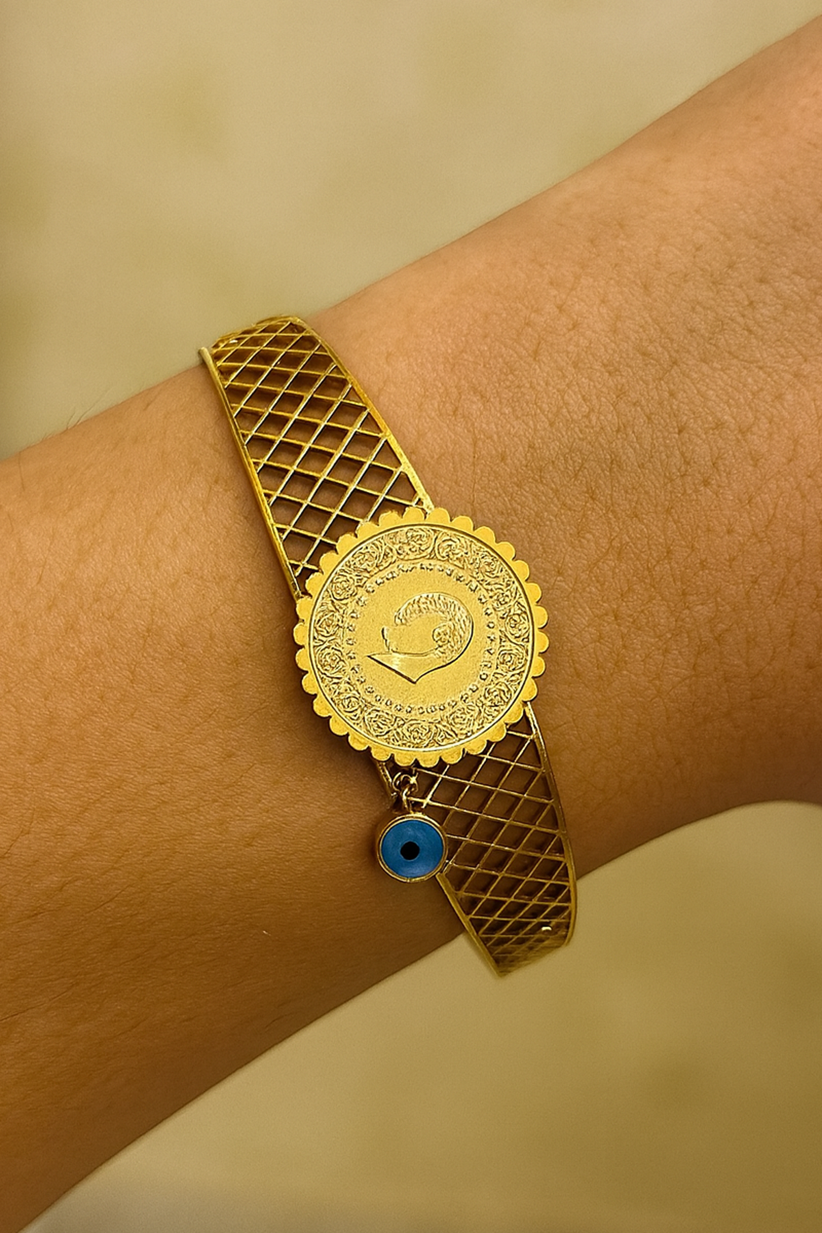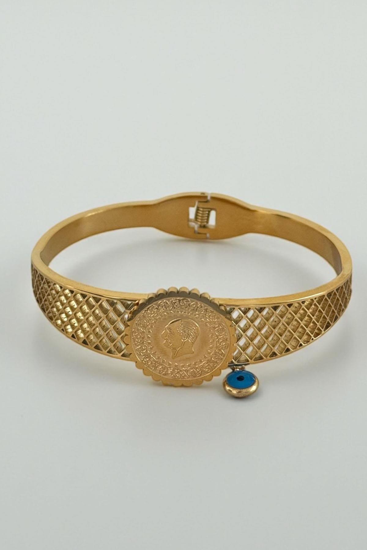 Altın Renk Çeyrek Figürlü Çelik Kelepçe Bileklik