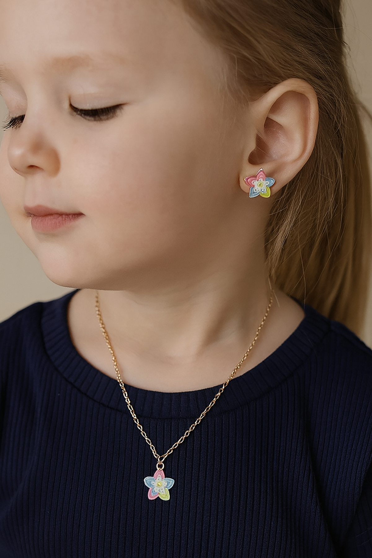Minik prensesler için özel olarak tasarlanmış bu şirin takı seti, rengarenk çiçek deseniyle çocukların tarzına neşe katıyor. 🌈 Kalp şeklindeki kutusunda kolye ve küpelerden oluşan set, günlük kullanımda da özel günlerde de tercih edilebilecek zarif bir hediye alternatifi.