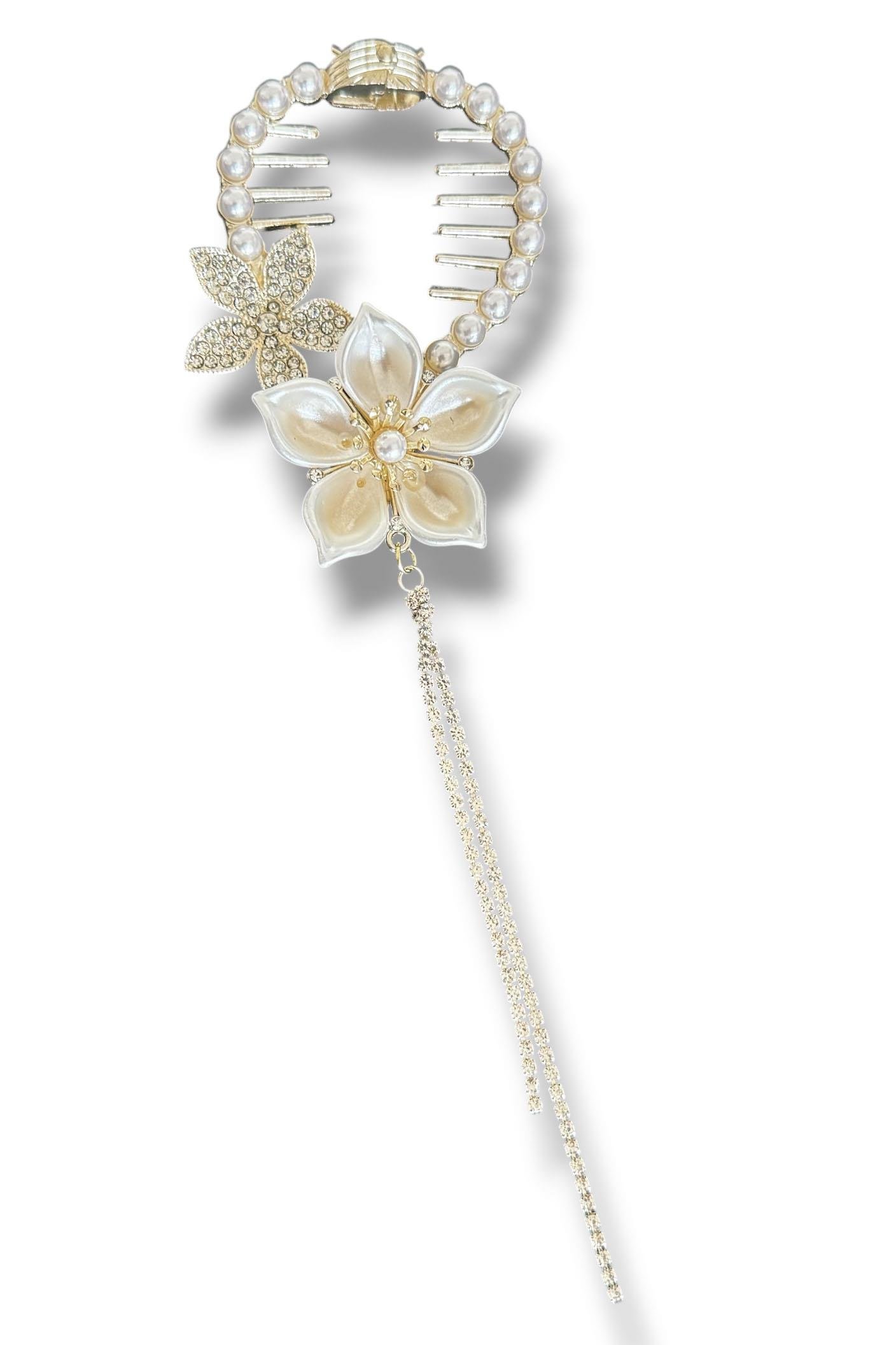 Altın Renk Çiçek Figürlü İnci Ve Taş Detaylı Topuz Toka