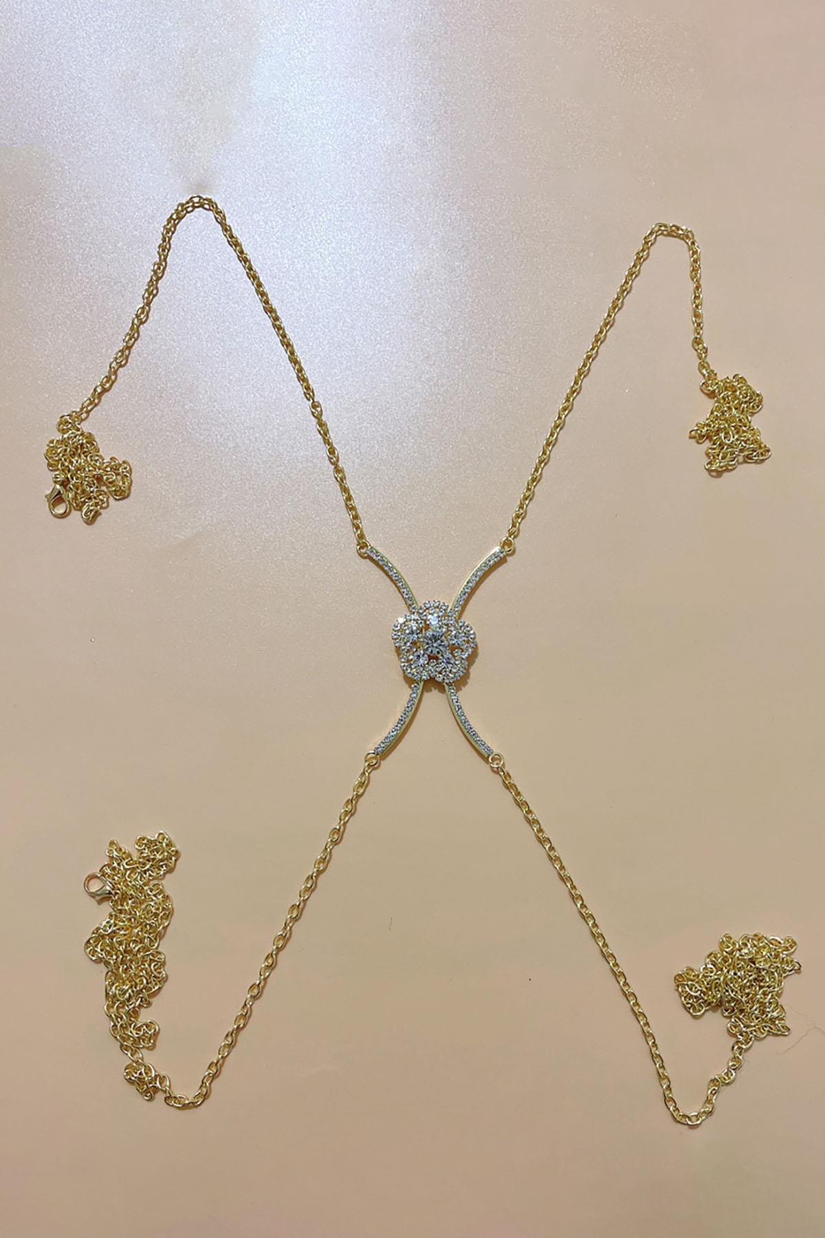 Altın Renk Çiçek Figürlü Taş Detaylı Tasarım Vücut Aksesuar