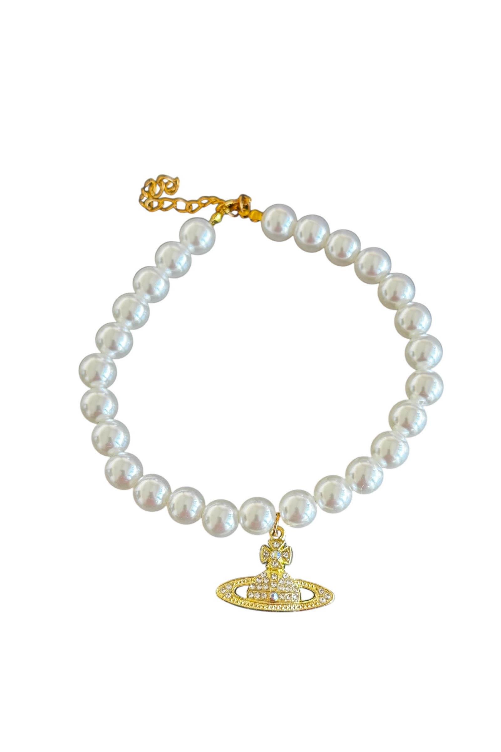 Parlak inci detayları ve altın renkli taşlı gezegen kolyesiyle bu aksesuar, özel günlerde veya fotoğraf çekimlerinde mükemmel bir tamamlayıcıdır.