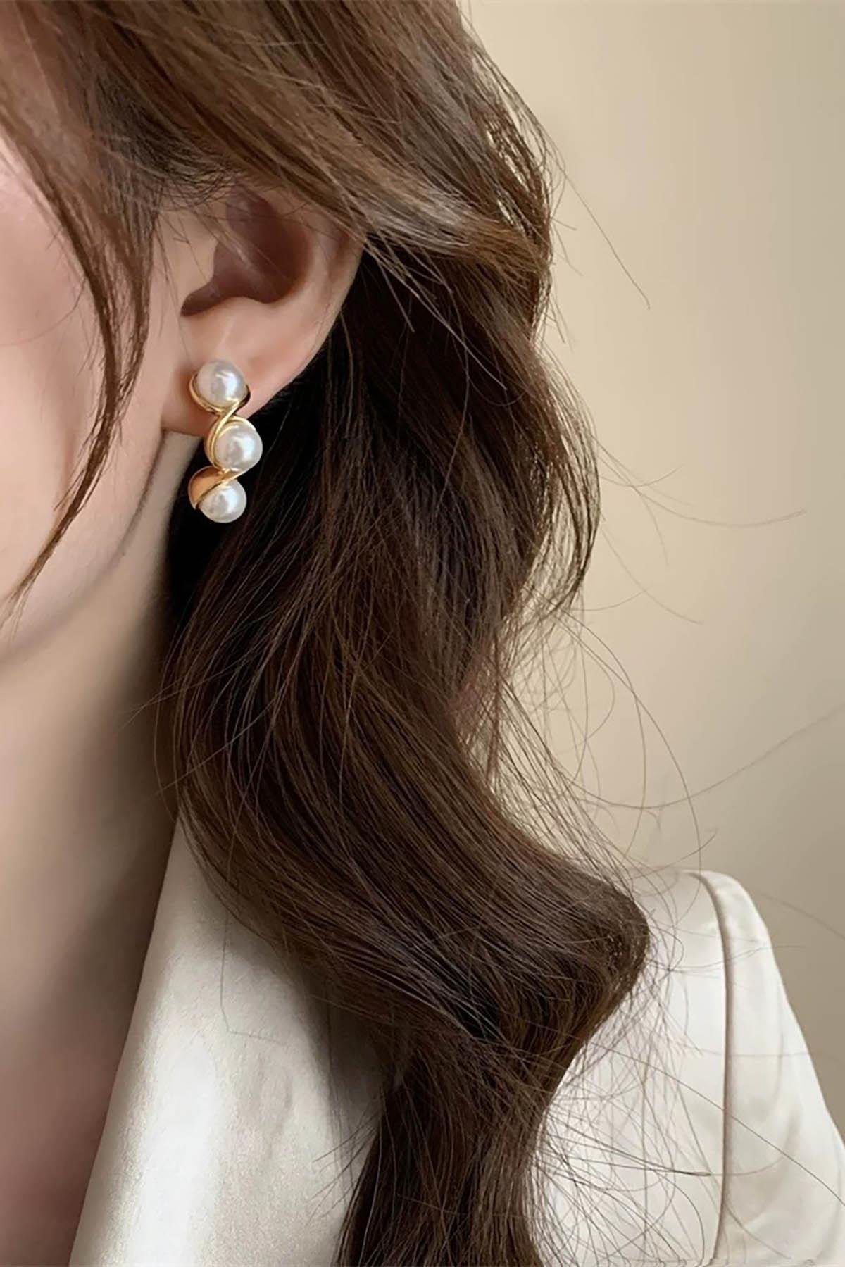 Altın Renk İnci Detaylı Çelik Küpe (Çift)