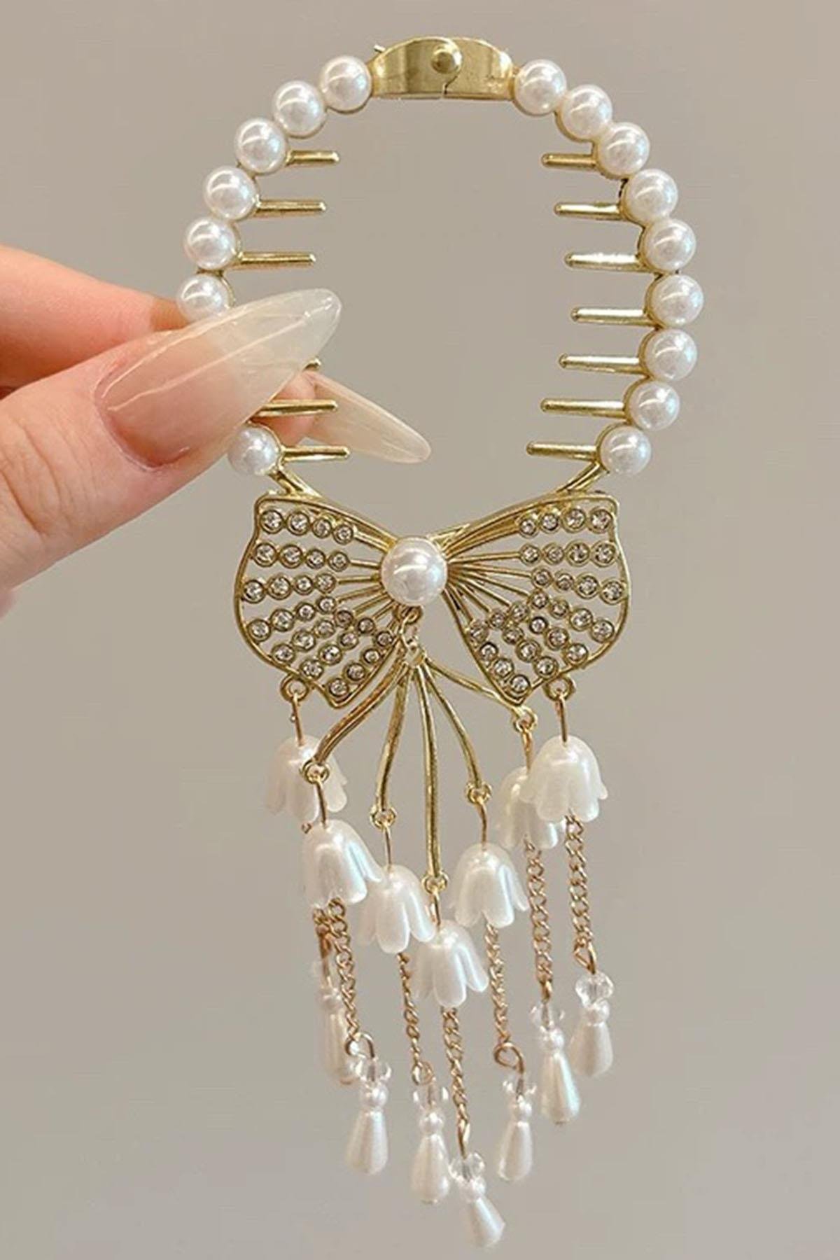 Altın Renk İnci Ve Taş Detaylı Sallantılı Topuz Tokası