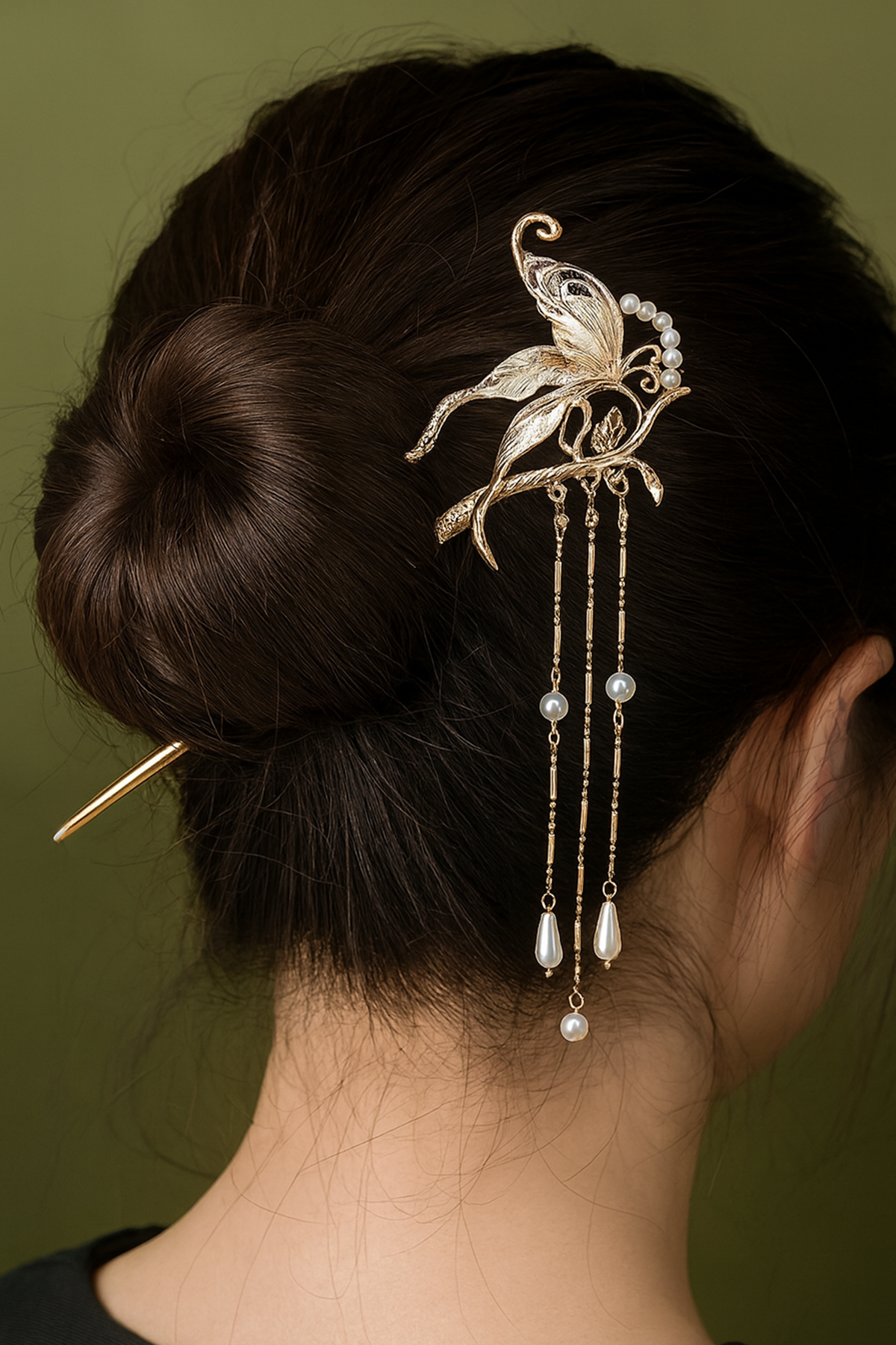 Altın Renk Kelebek Figürlü İnci Detaylı Sallantılı Topuz Toka