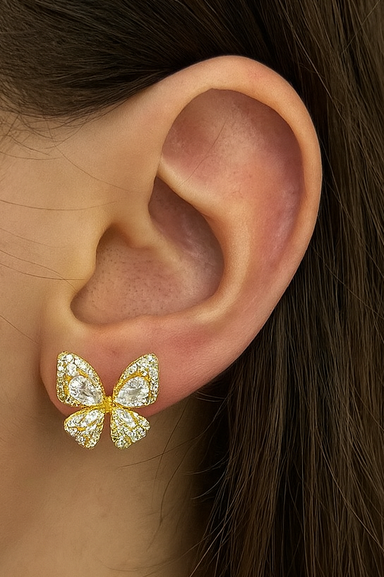 Altın Renk Kelebek Figürlü Taş Detaylı Küpe (Çift)