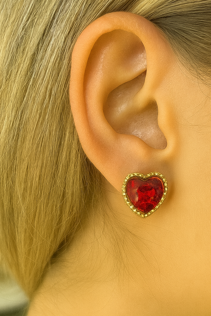 Altın Renk Kırmızı Kalp Figürlü Taş Detaylı Küpe (Çift)