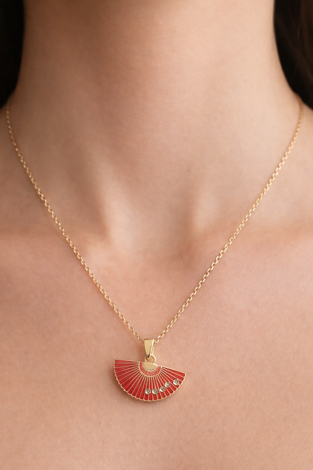 Altın Renk Kırmızı Yelpaze Figürlü Çelik Kolye