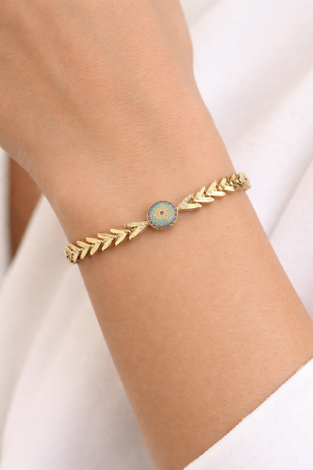 Altın Renk Nazar Boncuğu Figürlü 14K Altın Kaplama VİP Bileklik