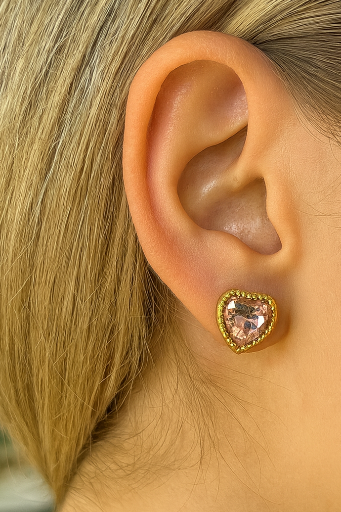 Altın Renk Pembe Kalp Figürlü Taş Detaylı Küpe (Çift)