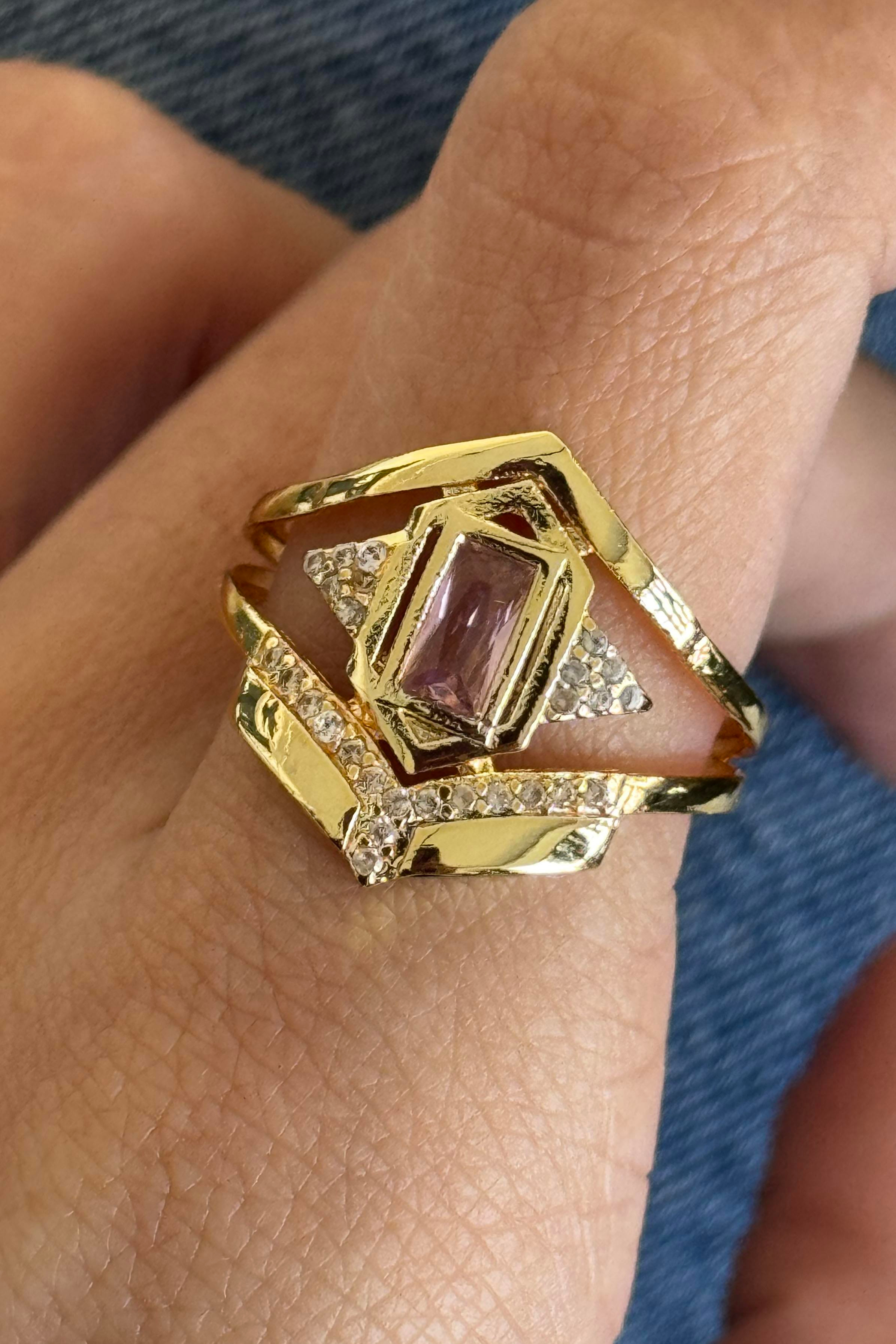 Altın Renk Taş Detaylı Ayarlanabilir Yüzük