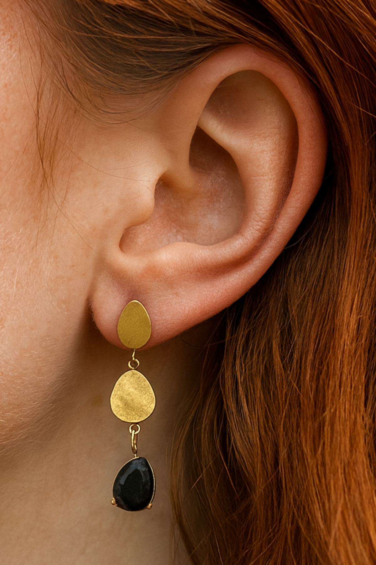 - Zarif tasarımıyla dikkat çeken bu çift küpe, altın rengi detaylarıyla göz alıcı bir görünüm sunar.