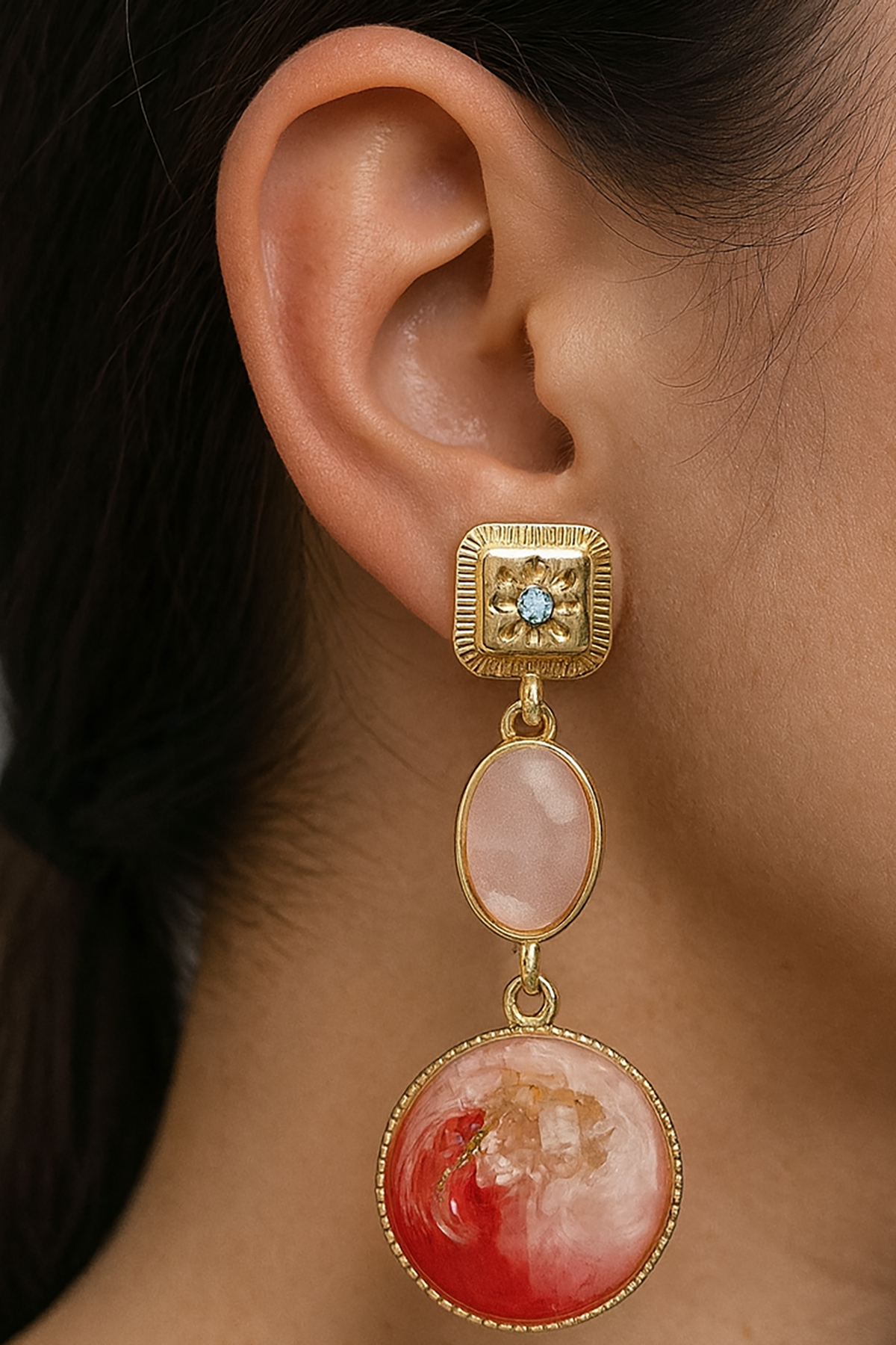 - Zarif tasarımıyla dikkat çeken bu çift küpe, altın rengi detaylarıyla göz alıcı bir görünüm sunar.