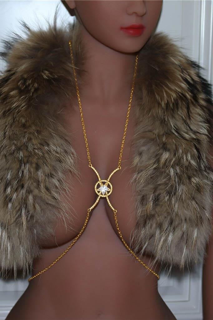 Şıklığı ve cesur tarzı bir araya getiren bu gold vücut aksesuarı, özel gün kombinlerinize zarif bir dokunuş katmak için tasarlandı. Göğüs ortasında yer alan taş detaylı yuvarlak motif, aksesuarın hem odak noktası hem de en ışıltılı kısmını oluşturur. İnce zincir yapısı sayesinde vücuda hafifçe oturur ve ten üzerinde son derece zarif durur.