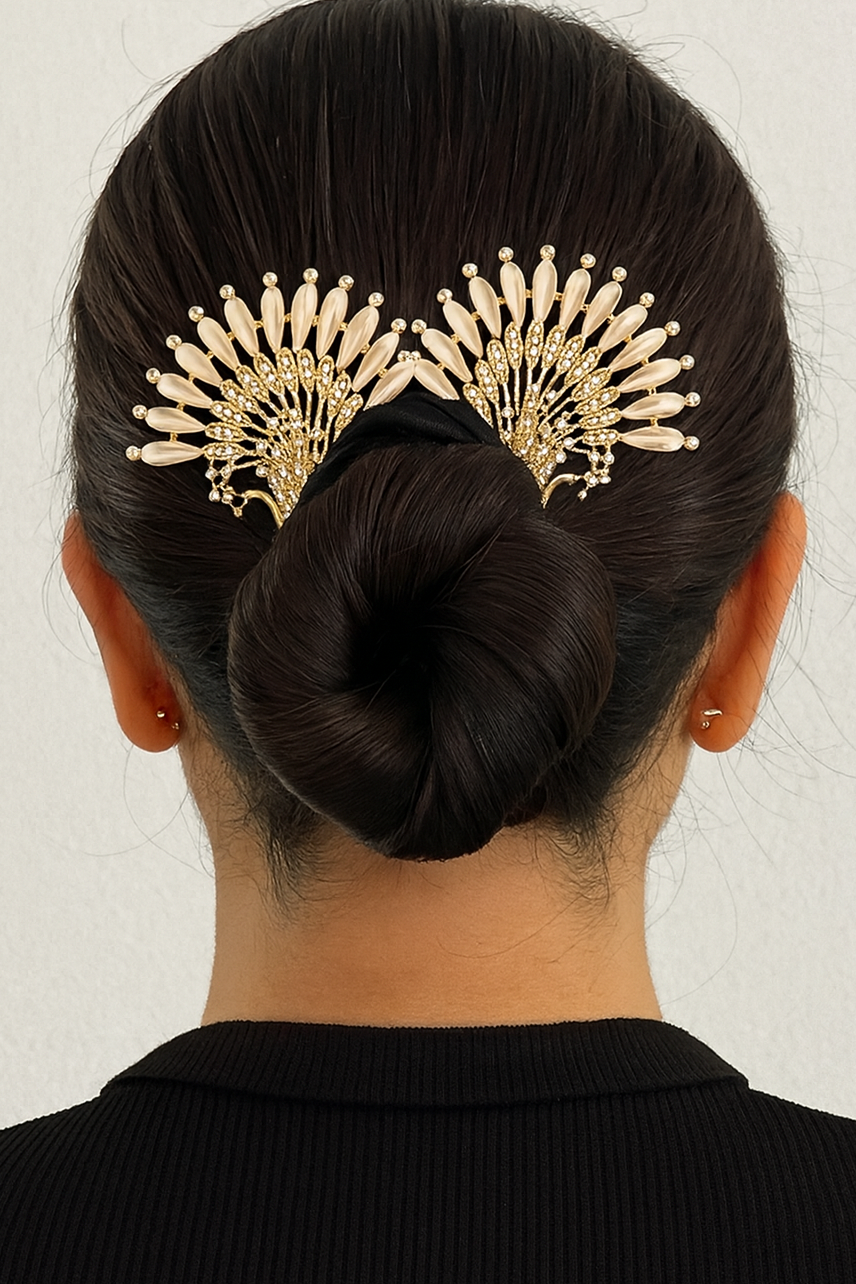 Altın Renk Tavus Kuşu Figürlü Taş Detaylı Topuz Tokası