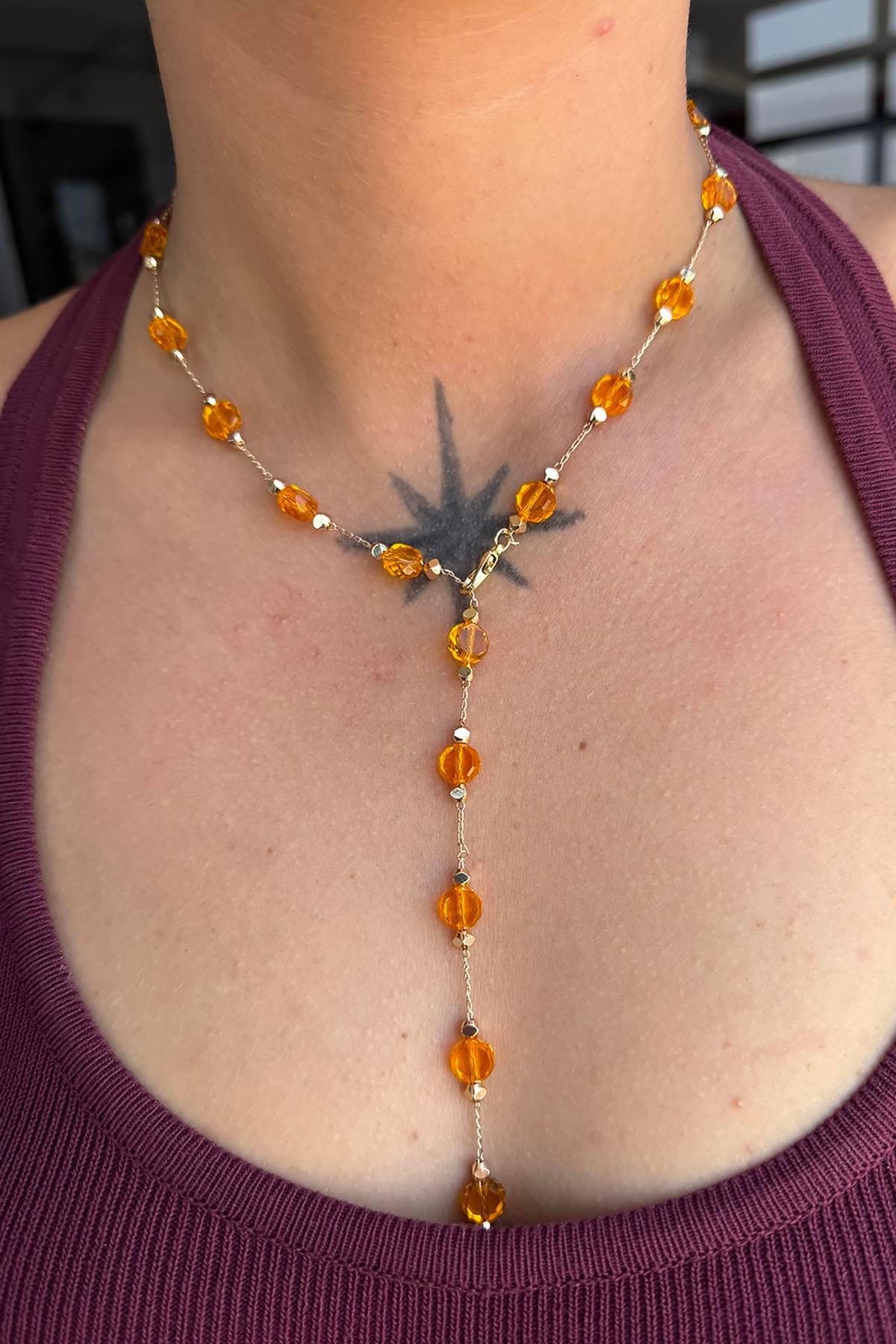 Altın Renk Turuncu Taş Detaylı Çelik Y Kolye