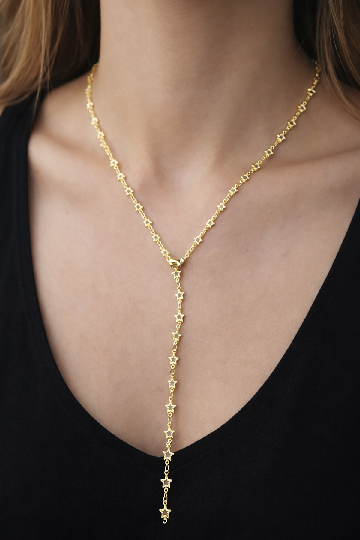 Altın Renk Yıldız Figürlü Taş Detaylı Y Kolye