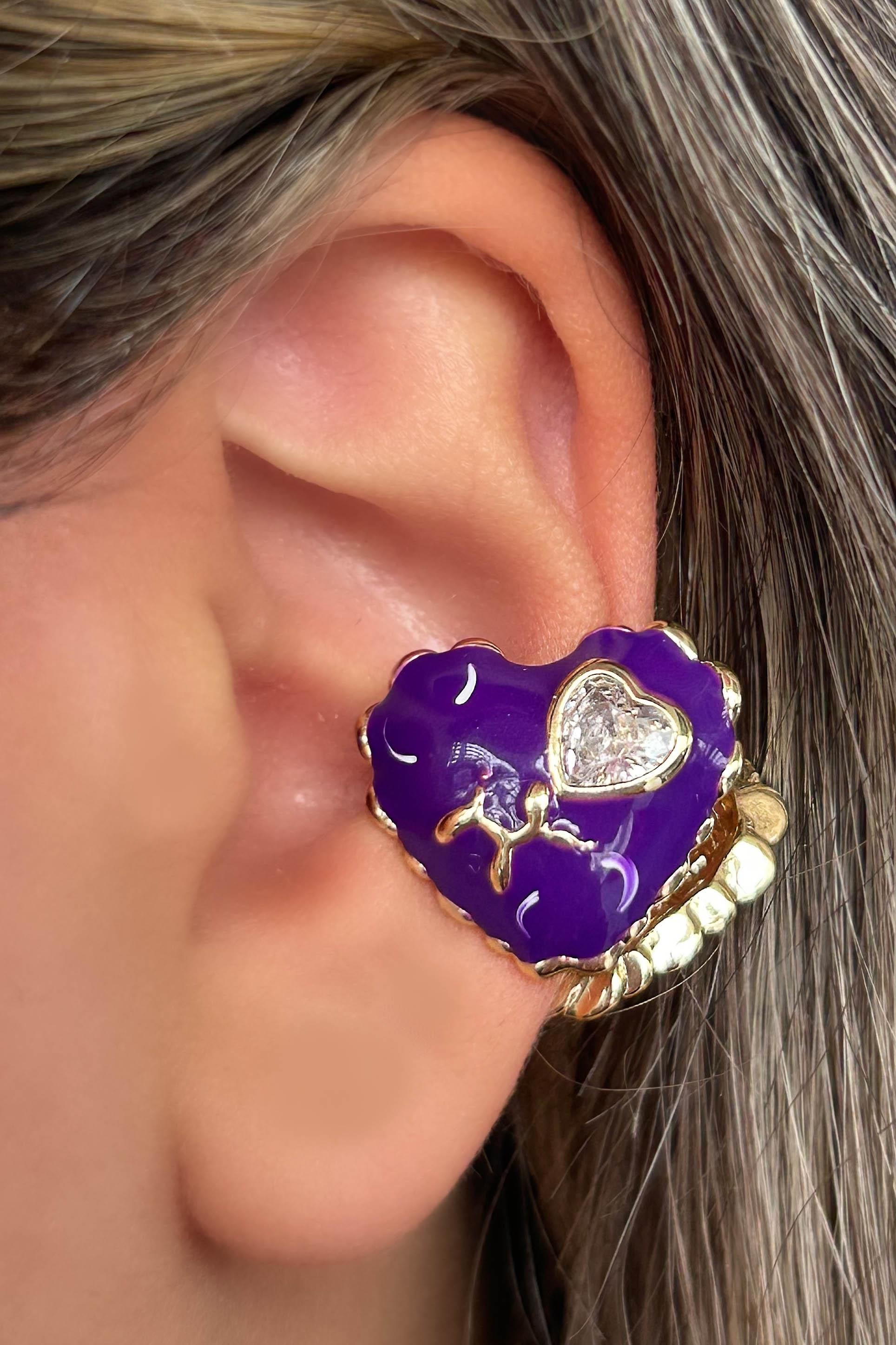 Altın Ve Mor Renk Kalp Figürlü 14K Altın Kaplama TX Ear Cuff (Tek)