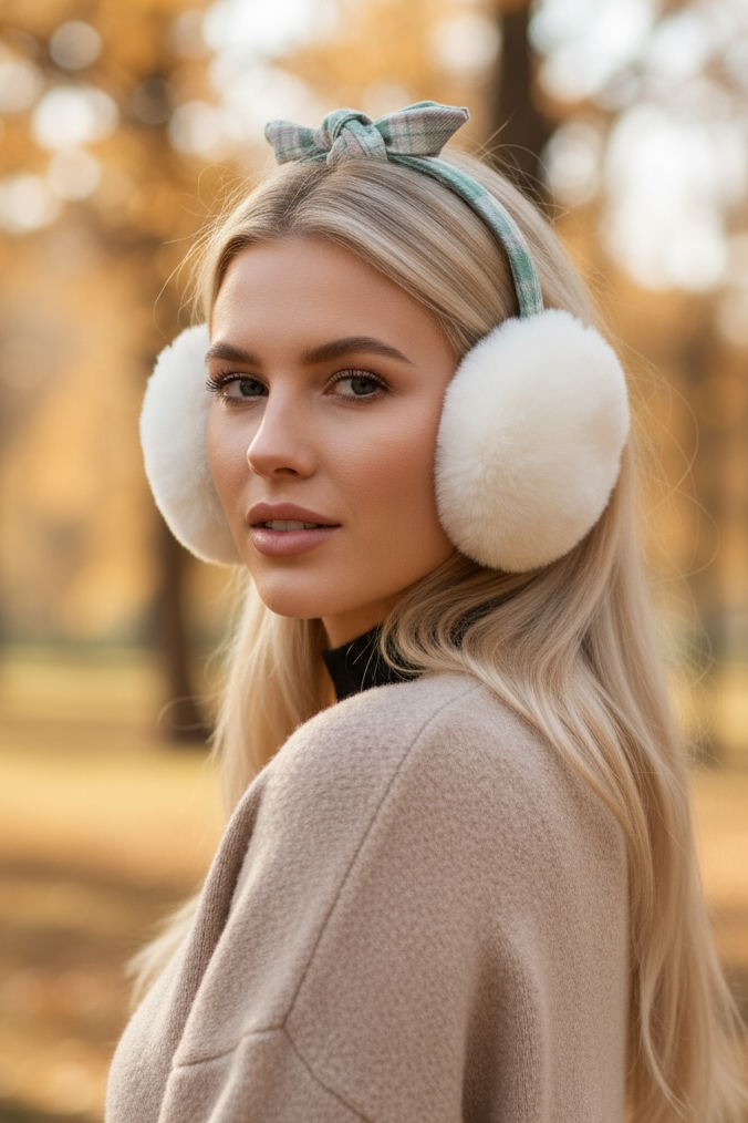 Beyaz Renk Ekose Desenli Peluş Kulaklık