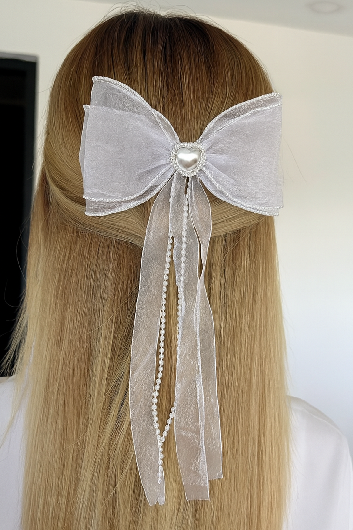 Beyaz Renk Kalp Figürlü İnci Detaylı Kurdele Otomat Toka