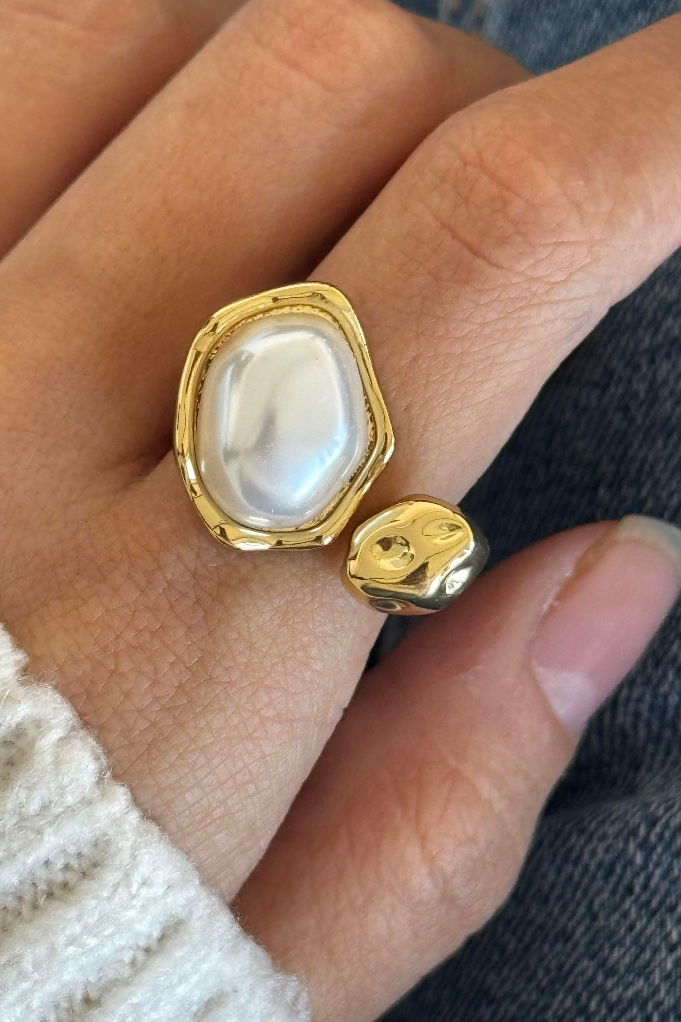 Altın Renk İnci Detaylı Ayarlanabilir Çelik Yüzük