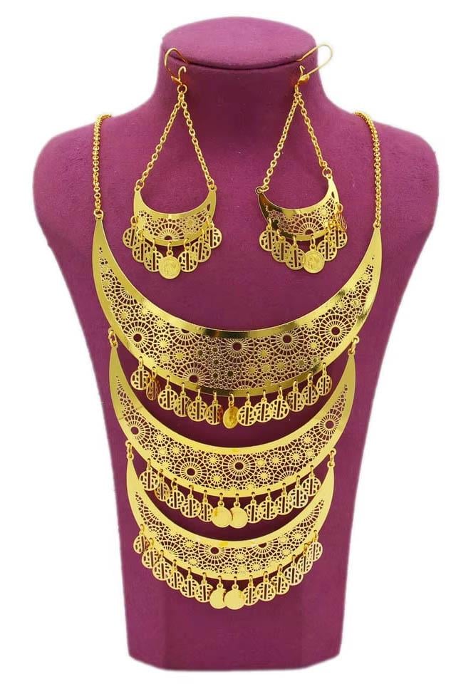 Altın Renk Sallantılı Kolye Ve Küpe Düğün Kına Nişan Gelin Seti