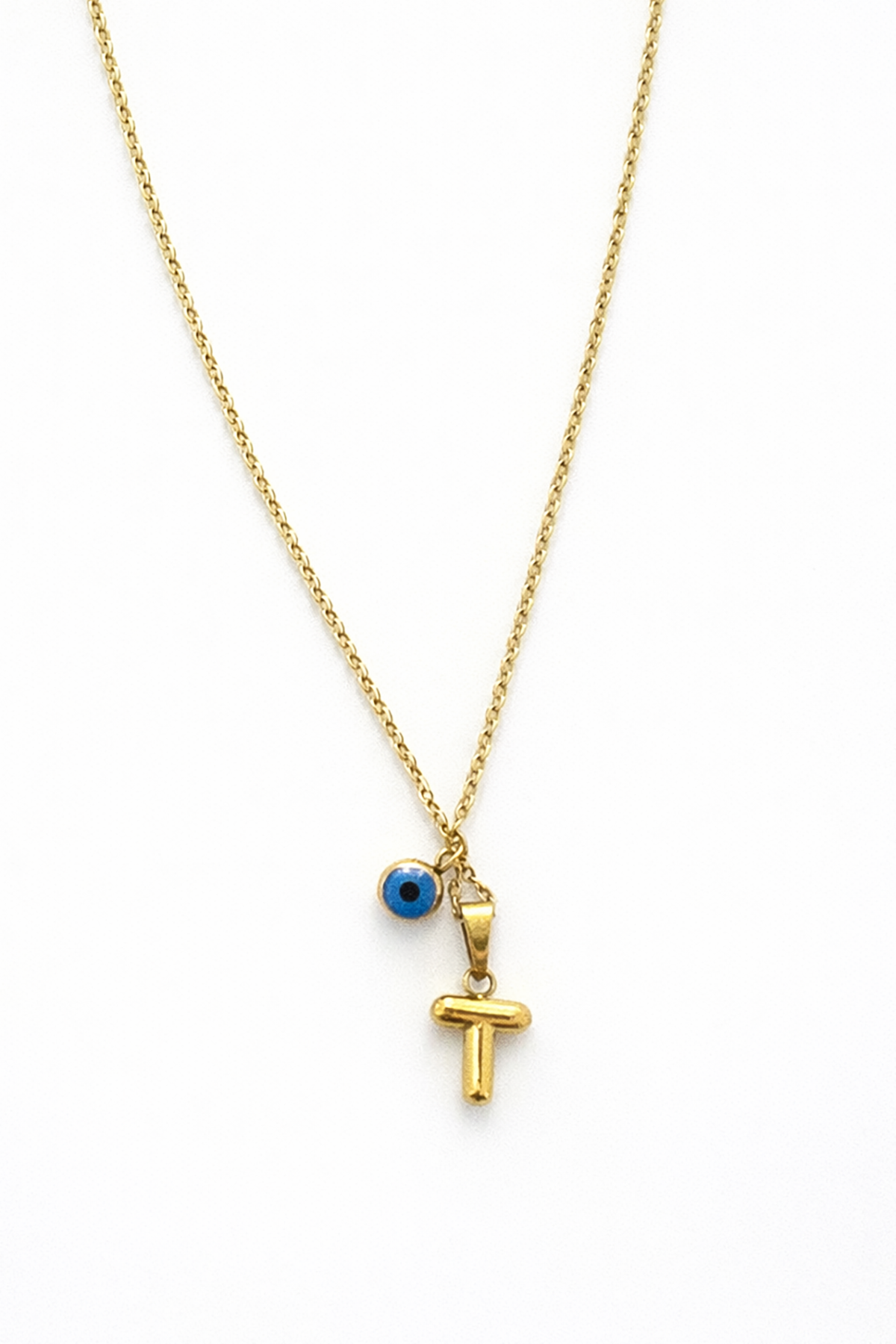 Altın Renk T Harfli Nazar Boncuk Detaylı Çelik Kolye