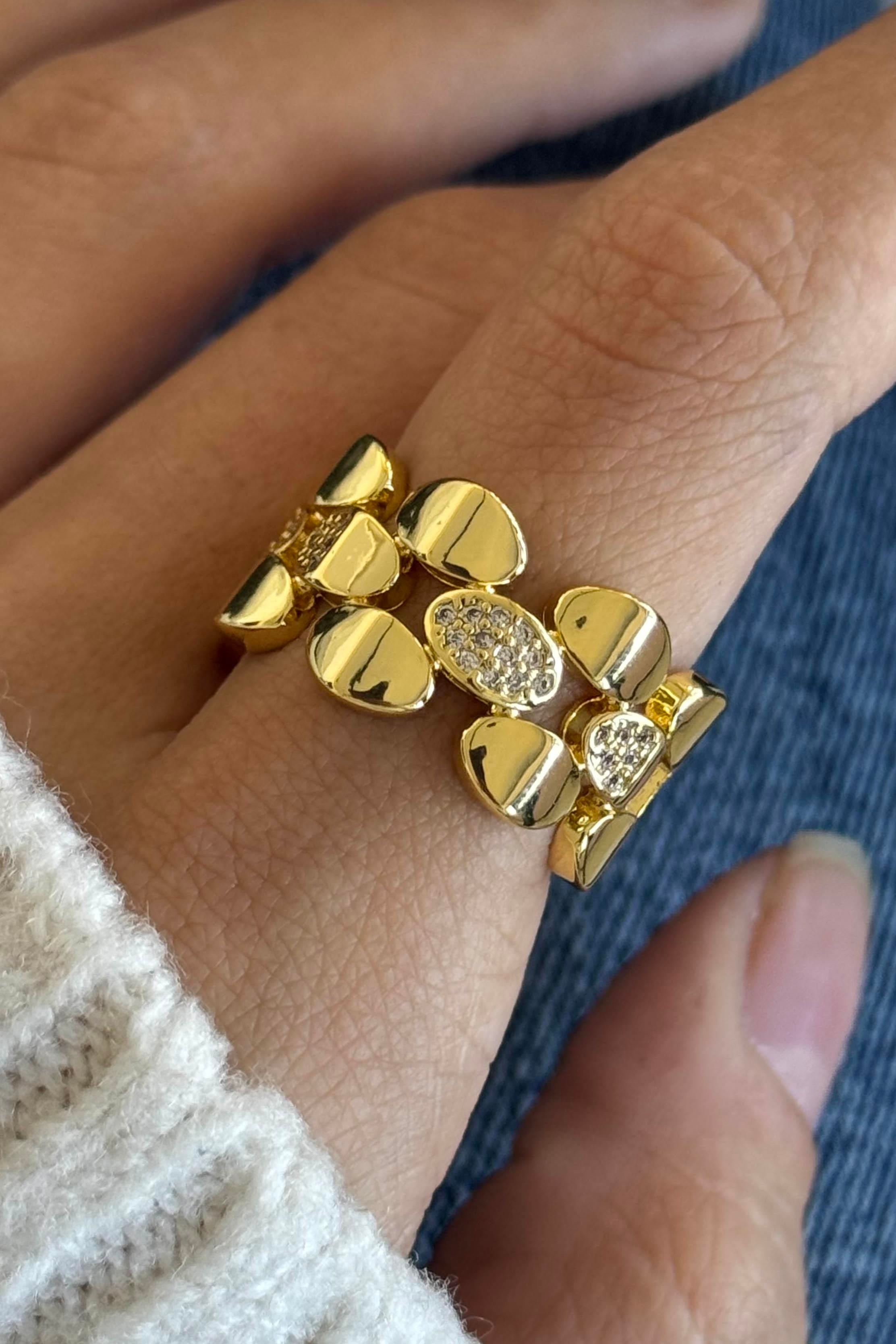 Altın Renk Taş Detaylı Ayarlanabilir Çelik Yüzük