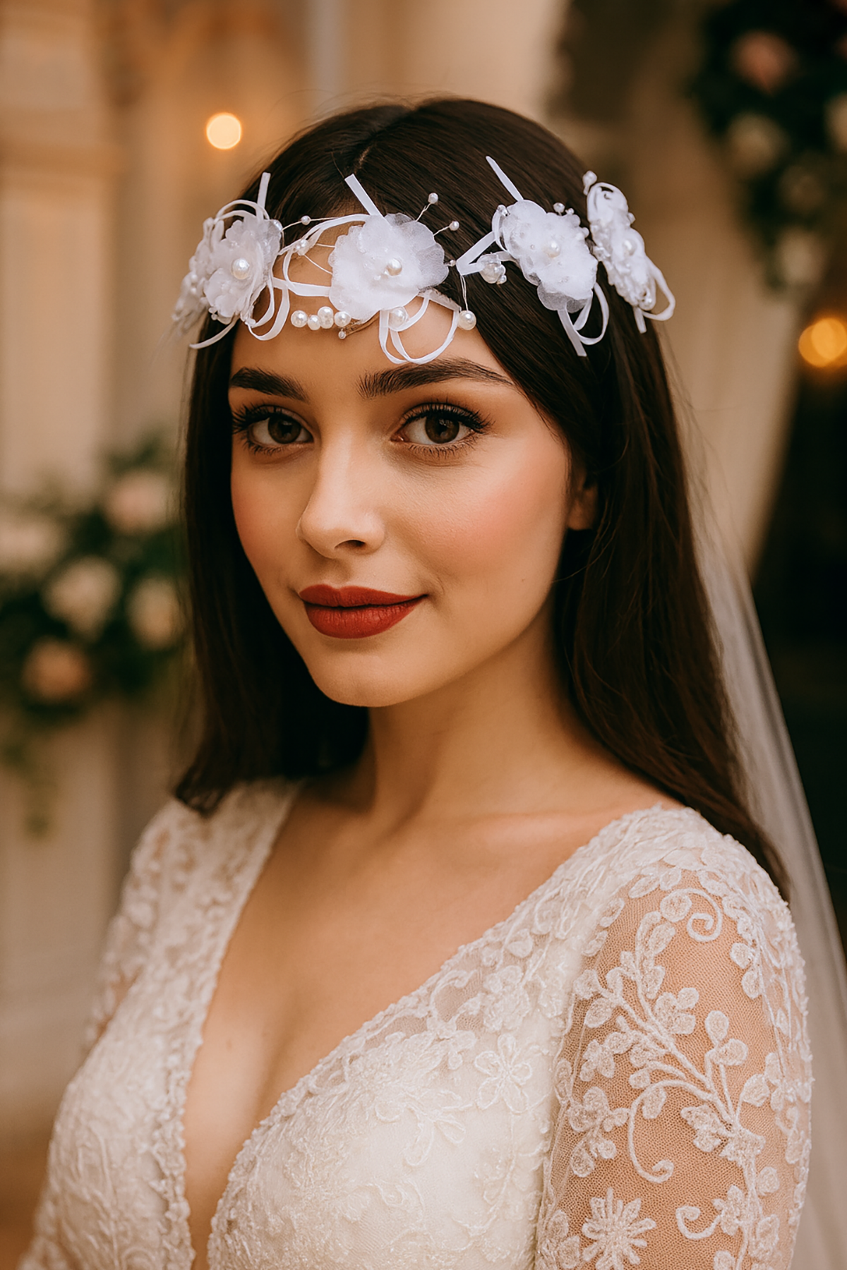 Gümüş Renk Çiçek Figürlü İnci Detaylı Saç Aksesuarı/ Alınlık