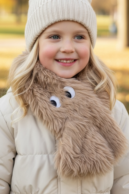 Kahverengi Göz Detaylı Peluş Çocuk Atkı