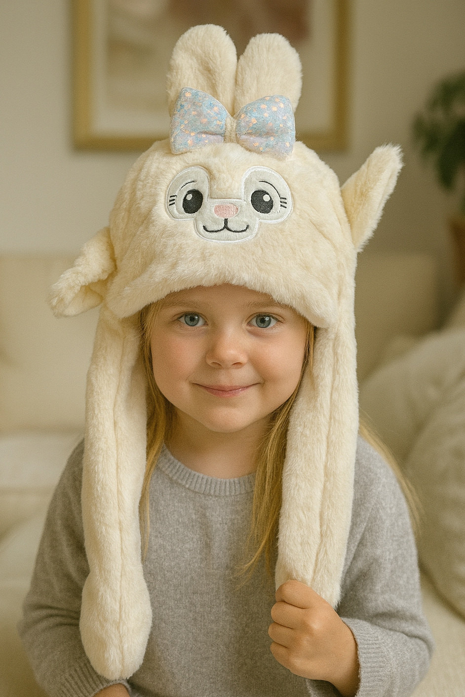 Krem Renk Tavşan Figürlü Kulakları Oynayan Peluş Şapka