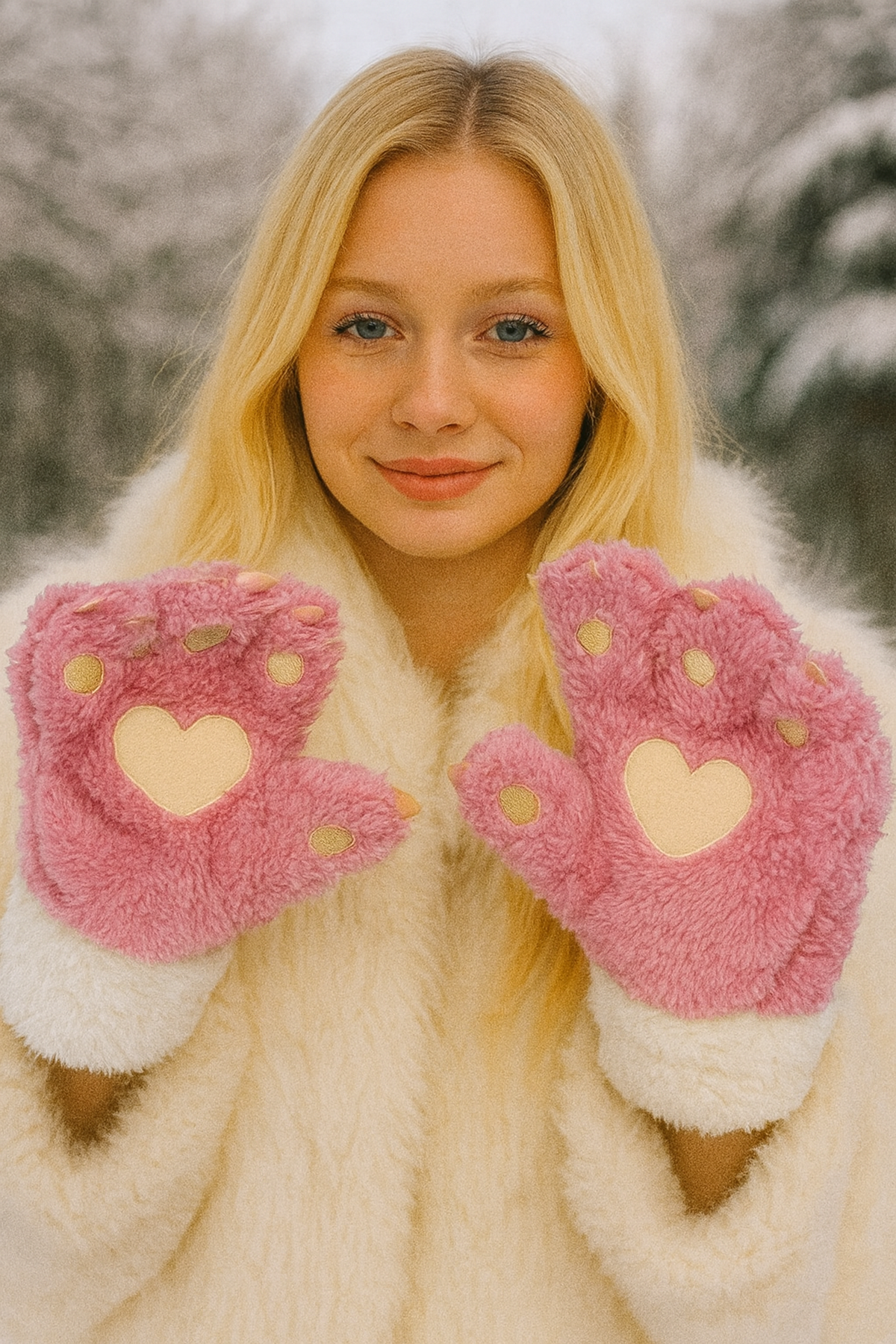 Krem Ve Pembe Pati Figürlü Askılı Peluş Eldiven