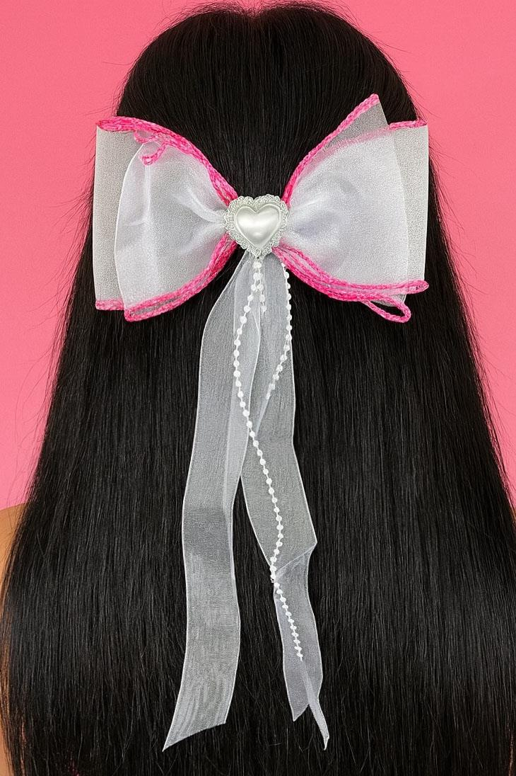 Pembe Ve Beyaz Renk Kalp Figürlü İnci Detaylı Kurdele Otomat Toka