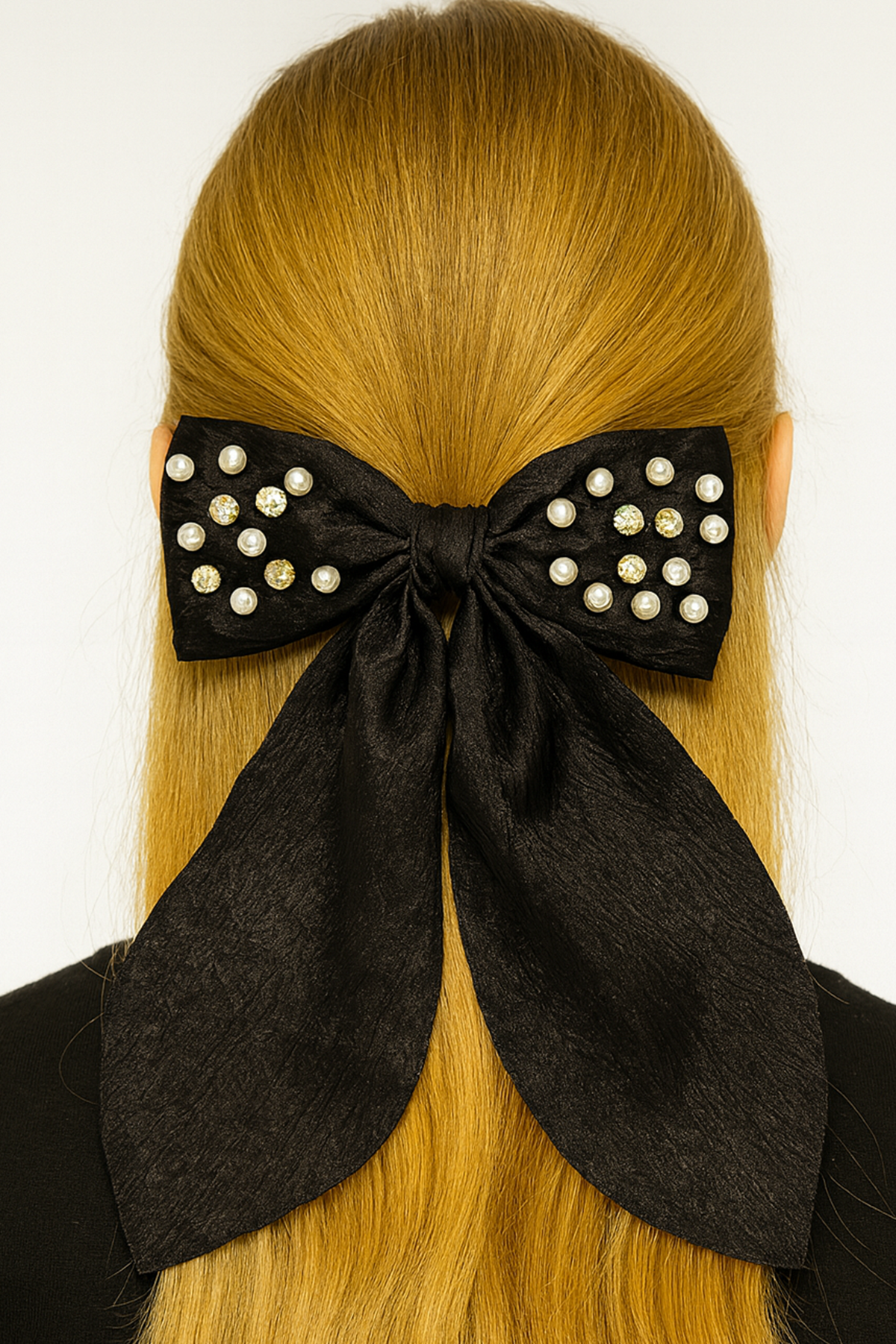 Siyah Renk Kurdele Figürlü İnci Ve Taş Detaylı Otomat Toka