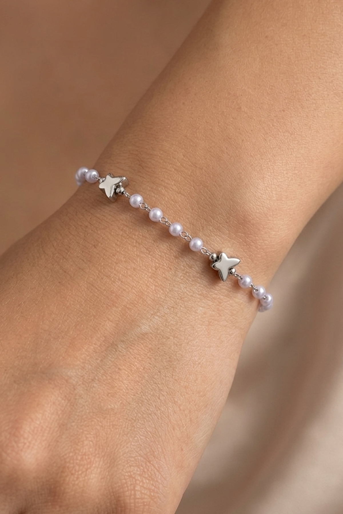 Gümüş Renk Kelebek Figürlü İnci Detaylı Çelik Bileklik