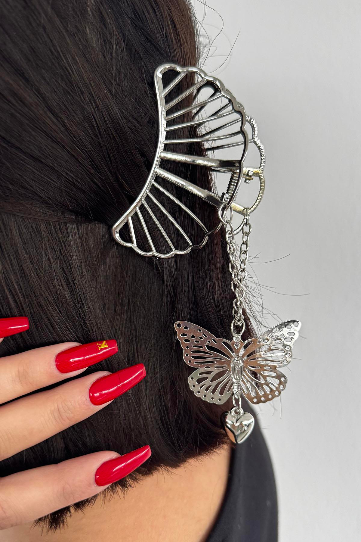 Gümüş Renk Kelebek Figürlü Sallantılı Metal Mandal Toka