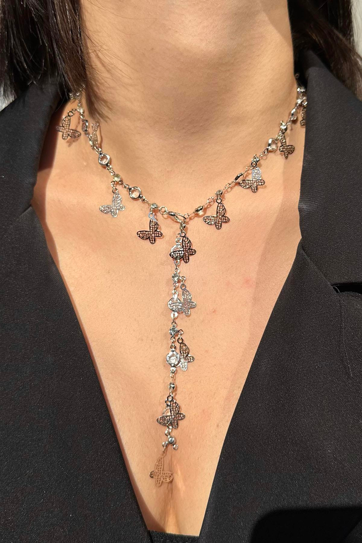 Gümüş Renk Kelebek Figürlü Taş Detaylı Çelik Y Kolye