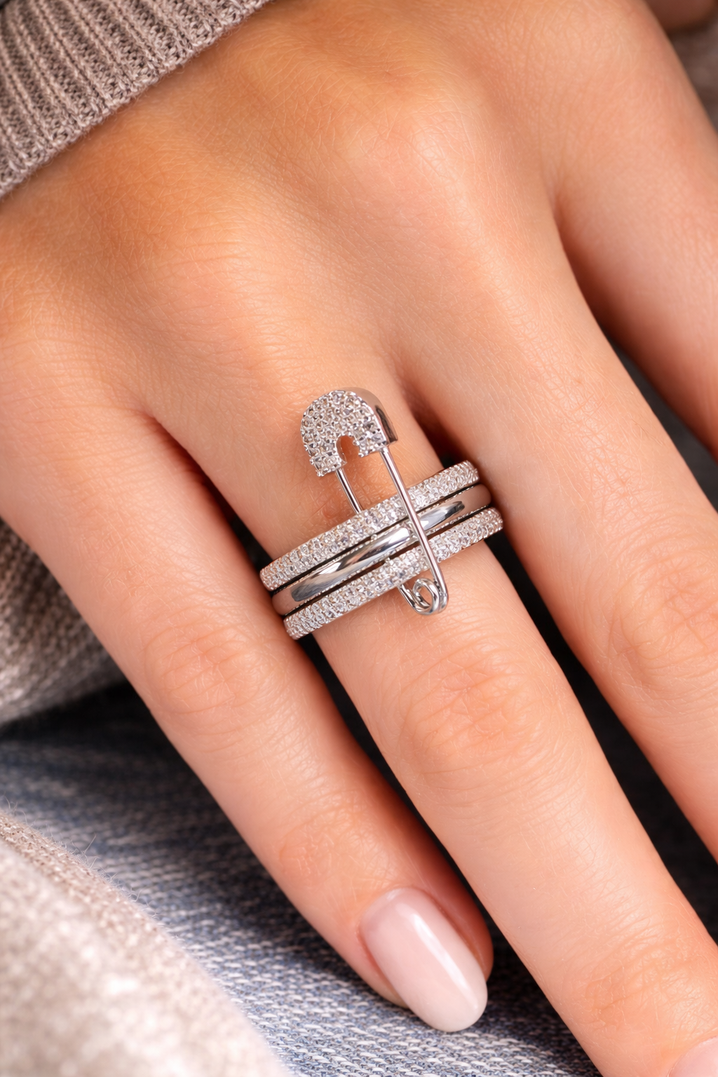 Gümüş Renk Kilitli İğne Detaylı Taşlı Yüzük