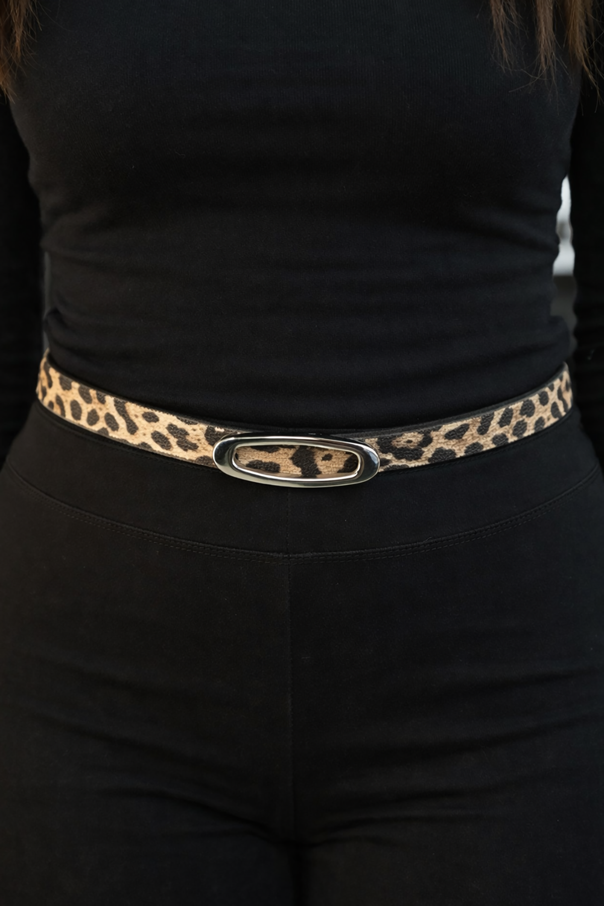 Gümüş Renk Leopar Desenli Kadın Deri Kemer